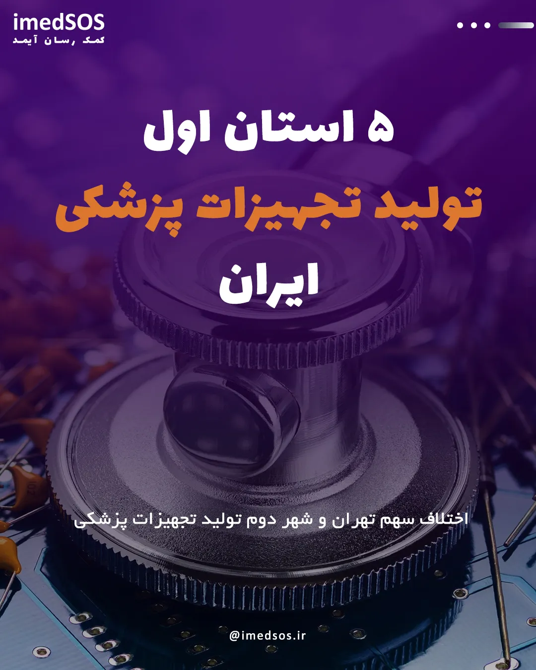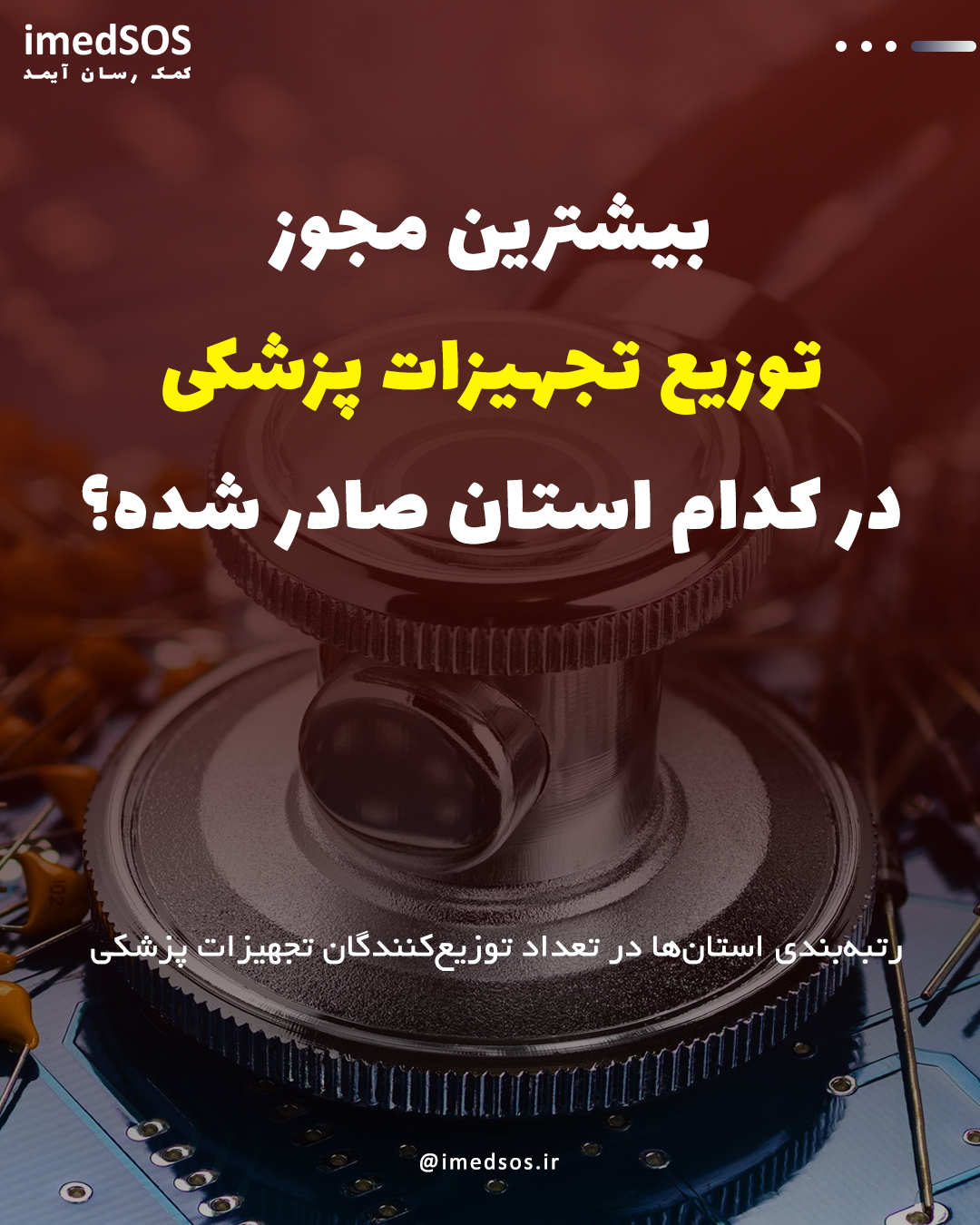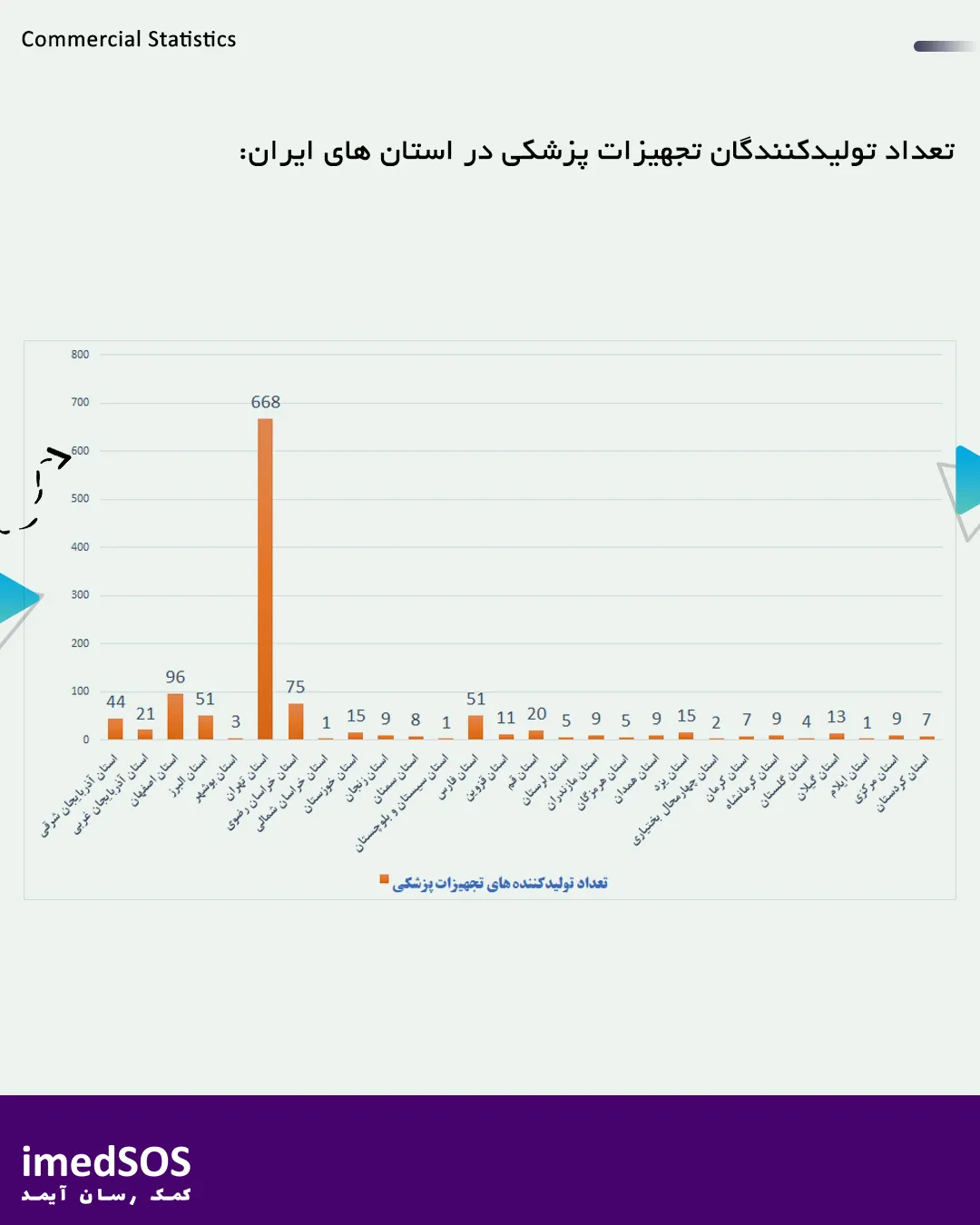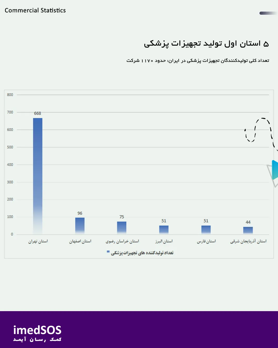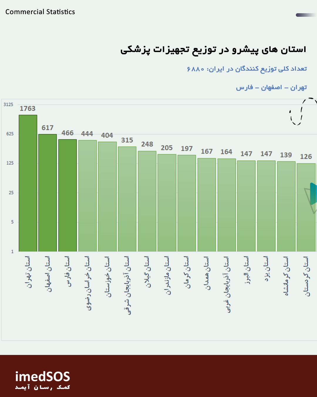 استان های پیشرو در توزیع تجهیزات پزشکی: تهران با 1763 شرکت – اصفهان با 617 شرکت – فارس 466 شرکت