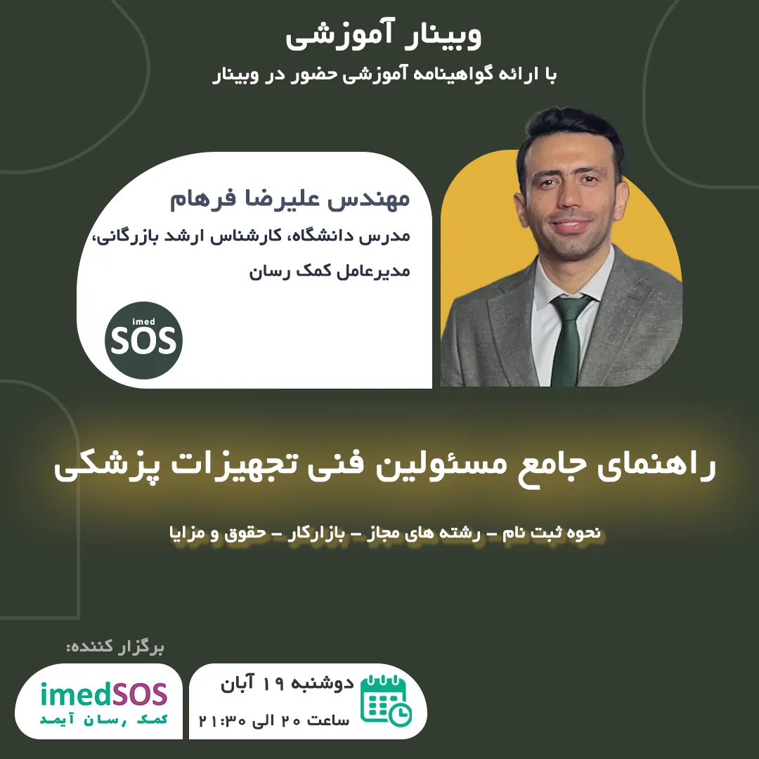 وبینار راهنمای جامع مسئول فنی تجهیزات پزشکی : از وظایف تا چالشها» فرصتی است برای آشنایی کامل با نقش، وظایف، الزامات قانونی و مسیر شغلی مسئول فنی در حوزه تجهیزات پزشکی. در این جلسه، با دیدی کاربردی به بررسی چالشهای واقعی، استانداردهای مورد نیاز و نکات کلیدی برای ورود حرفهای به این حوزه پرداخته میشود. اگر مهندس پزشکی هستید یا قصد دارید در شرکتهای تجهیزات پزشکی بهعنوان مسئول فنی فعالیت کنید، این وبینار نقطه شروعی مطمئن برای شماست.