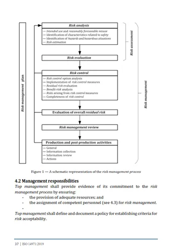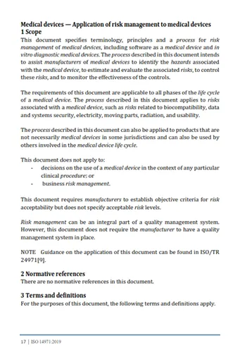 این سند اصطلاحات، اصول و فرایند مدیریت ریسک وسایل پزشکی از جمله نرم افزار به عنوان یک وسیله پزشکی و دستگاه های تشخیصی آزمایشگاهی را مشخص می کند. فرایند توصیف شده در این سند قصد دارد به تولیدکنندگان وسایل پزشکی کمک کند تا خطرات مرتبط با وسایل پزشکی را شناسایی کنند، ریسک مربوطه را تخمین و ارزیابی نمایند ، اقدامات کنترل ریسک را اجرا و اثر بخشی اقدامات کنترلی در نظر گرفته شده کنترل و نظارت کنند .